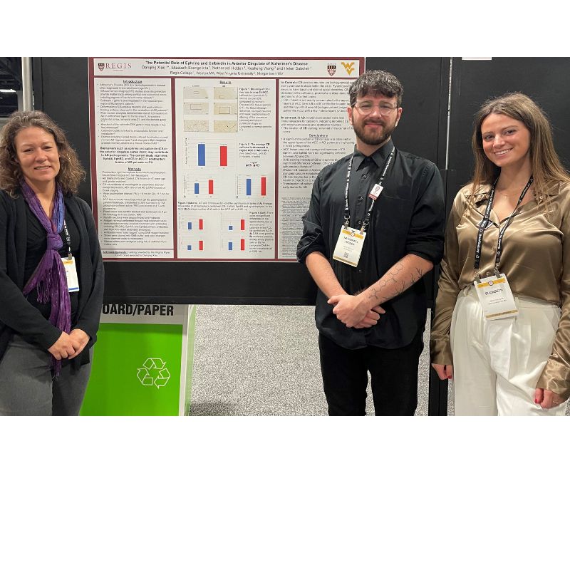 Nathanael Hidden '25, neuroscience and biology major, and Associate Professor of Psychology Helen Consiglio, in collaboration with Associate Professor of Biology Danqing Xiao and former student Elizabeth Evangelista, presented work titled "The Potential Role of Ephrins and Calbindin in the Anterior Cingulate of Alzheimer's Disease" at the Society for Neuroscience meeting in Washington, D.C. This event is the world's premier neuroscience meeting, drawing approximately 30,000 attendees each year and offers cutting edge scientific advances and professional development opportunities for neuroscientists and educators at all career stages. This work was funded by a Faculty Kaneb grant.