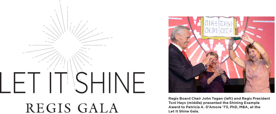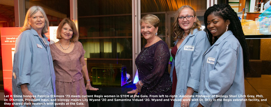 The Let It Shine Regis Gala, now in its fourth year, has raised millions of dollars for student scholarships—all of which is included in the comprehensive Now We Fly Campaign. On October 23, 2019, during Massachusetts STEM Week, Regis honored world-renowned researcher Patricia A. D’Amore ’73, PhD, MBA, with the university’s Shining Example Award. D’Amore, director of the Schepens Eye Research Institute, was honored for her groundbreaking work that helps treat various ocular vascular diseases affecting millions of people worldwide every year.