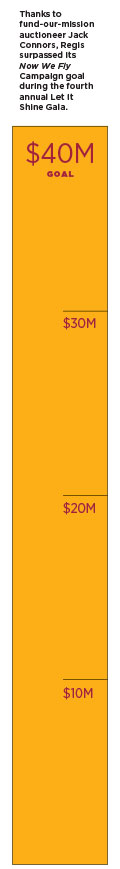 “When I became president of Regis, I knew the university had such great, untapped potential,” says Hays. “Regis has been making a significant impact in Greater Boston and around the world for years, and Now We Fly was all about telling the Regis story—being bold not only in our efforts to raise significant funding, but bold in shining a bright light on the great work we were already doing.”