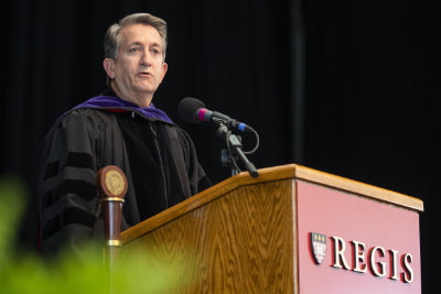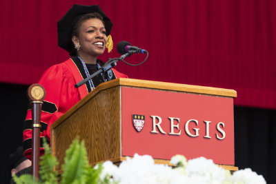Graduate student Regina Robinson who graduated with her doctorate in higher education leadership also addressed the audience about her dream deferred becoming a reality, “Now, because of our degrees from Regis College, we have a tremendously timely opportunity to transform society with what we’ve learned here.” Robinson’s hope is that the Class of 2022 will be remembered as leaders defined by a greater purpose, leaders who recognize greatness in people from every diverse walk of life, and leaders who are committed to making a greater impact on the world.