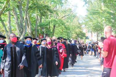 After the 2020 Convocation was held remotely due to COVID-19 health and safety protocols, Tuesday saw the return of traditions such as the faculty procession through the tunnel of cheering students. The procession was led by Vice President for Academic Affairs Mary Erina Driscoll, who participated in her first Convocation as the university’s chief academic officer.