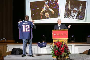Jack Connors returned as auctioneer and Kelley Tuthill, VP of Marketing and Communications at Regis, emceed. Patriots Hall of Famer Andre Tippett helped Connors auction Patriots tickets and signed Tom Brady and Rob Gronkowski jerseys. Renowned sculptor Nancy Schön created an original piece of art that was presented to Mr. Sloane by Regis President Antoinette Hays and John Tegan, chair of Regis Trustees and chairman of Communication Technology Services.