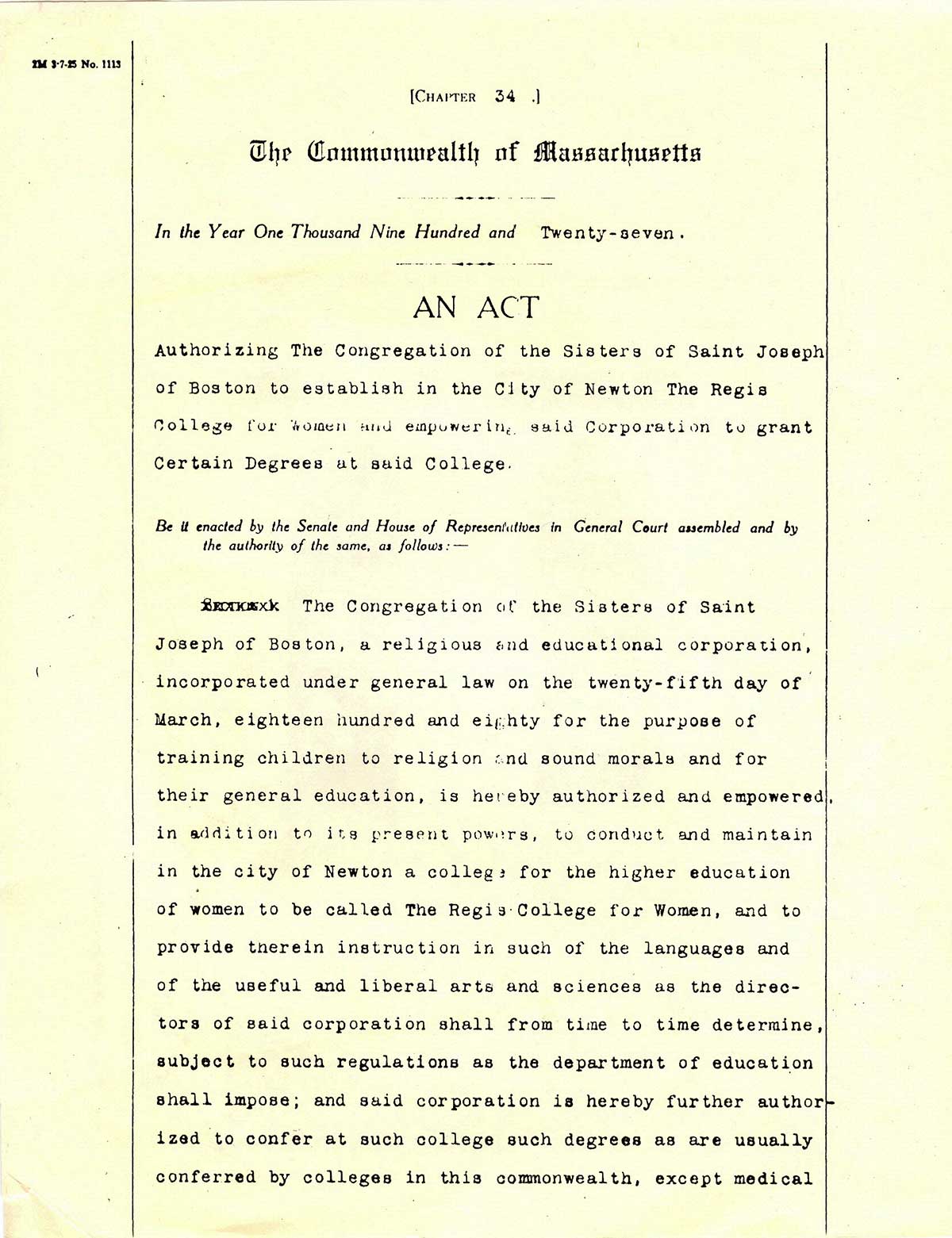 Since the late 1800s, the Sisters of St. Joseph have run 125 educational institutions in the Boston area. They founded Regis College at a time when higher education options for women were limited. The mission of providing access to an education based on Christian values and striving for excellence tempered with gentleness endures today on a campus that prides itself on welcoming all without distinction. The school was initially to be located in Newton, Massachusetts, as stated by the original charter of May 27, 1927. However, shortly after this charter was drafted the Morrison Estate on Wellesley Street in the town of Weston, Massachusetts, became available.
