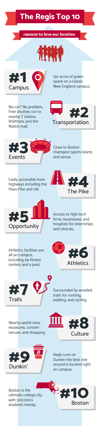 Regis College is located at 235 Wellesley Street in Weston, Massachusetts. Our campus location is the perfect mix of suburban and urban connections. Check out more reasons to love our location below.