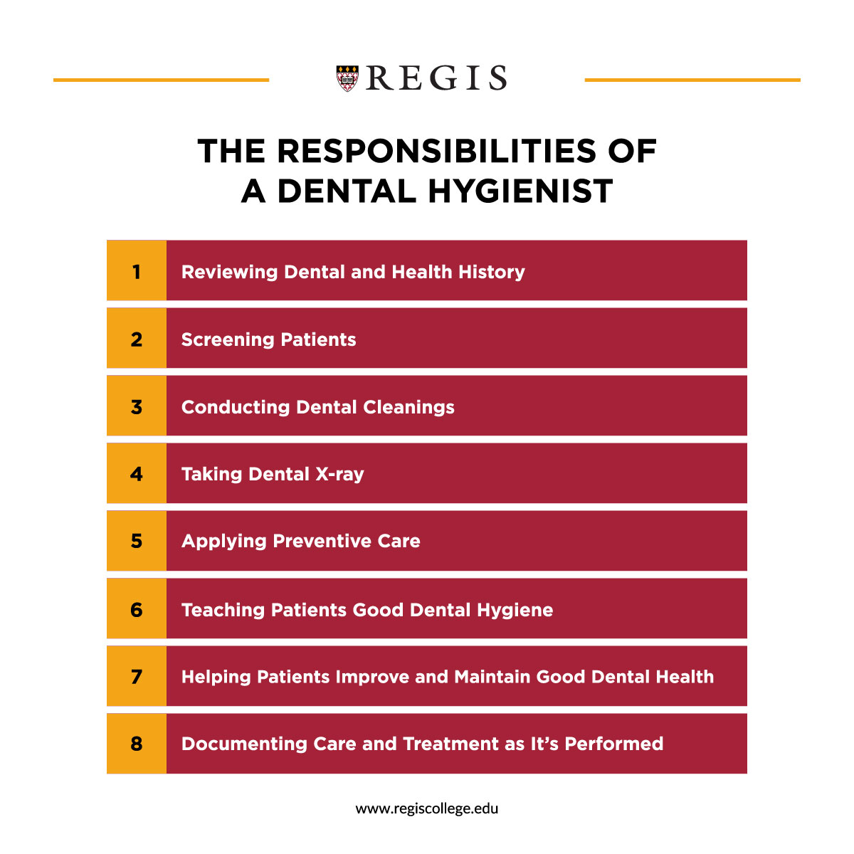 Regis College is one of the preeminent dental hygiene programs in New England, offering both associate and bachelor of science degrees. Our program has very high success rates, with 100% of students participating in outreach projects while in the program. Regis students have access to a campus dental center, which is home to an active dental hygiene practice. After their third year of study, students will be eligible to take board exams for licensure.