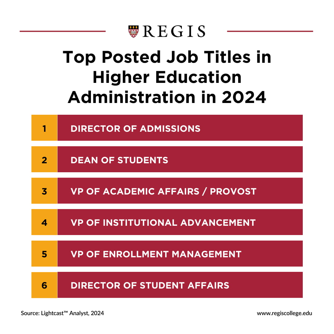 According to job posting data, the top posted job titles in higher education administration in 2024 include Director of Admissions, Dean of Students, and VP of Academic Affairs / Provost.