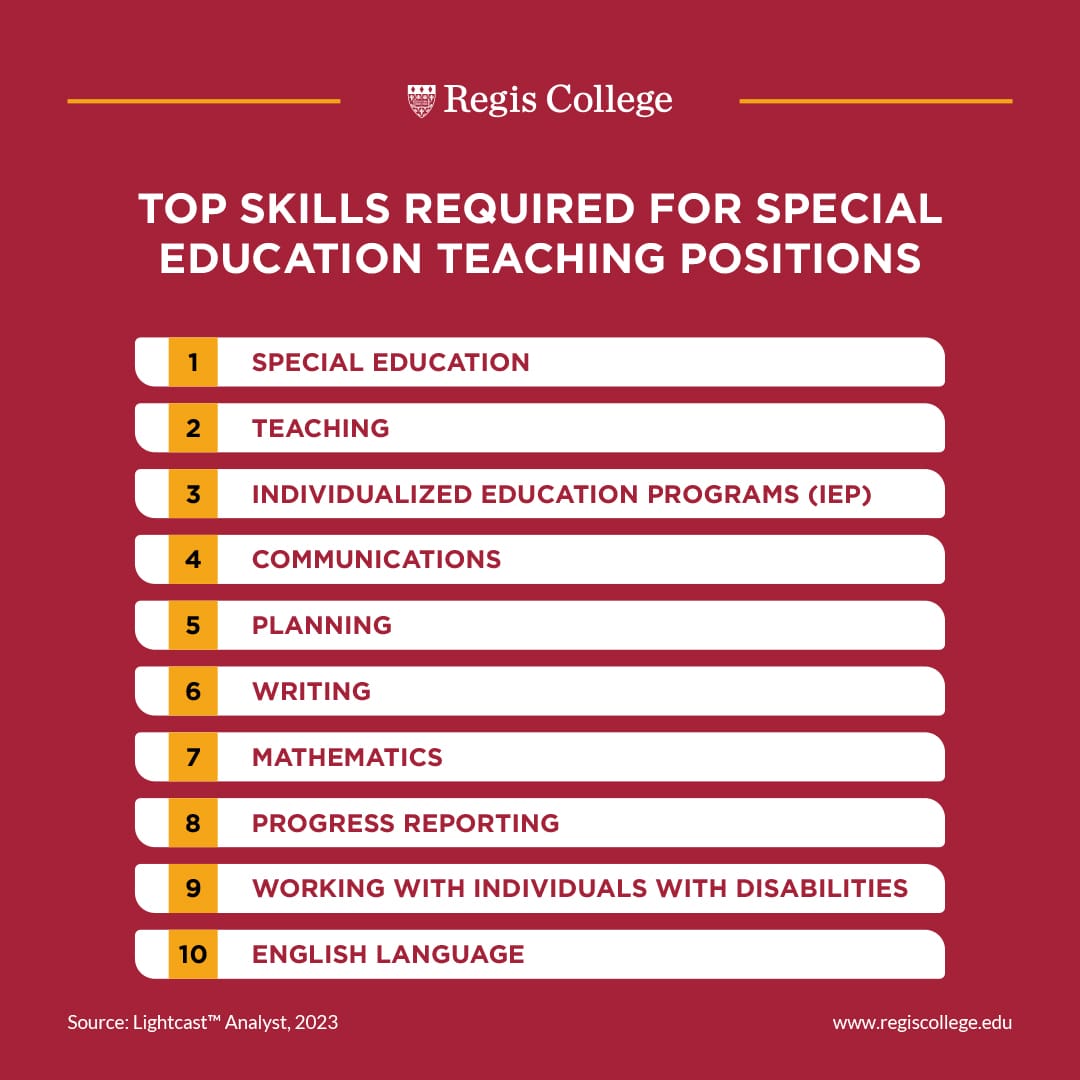 According to our analysis of job postings data, the top skills required for special education teaching positions include: