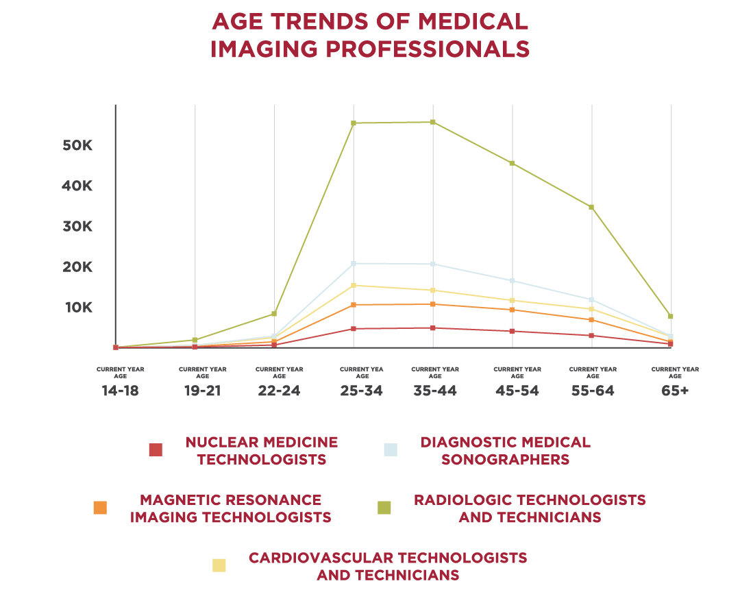 Taking a closer look at the average age trends of medical imaging careers can also speak to career mobility potential in the field. According to analysis of labor insights data, there’s a similar number of young medical imaging professionals (22–24 years of age) to seasoned ones (65+ years of age) practicing.