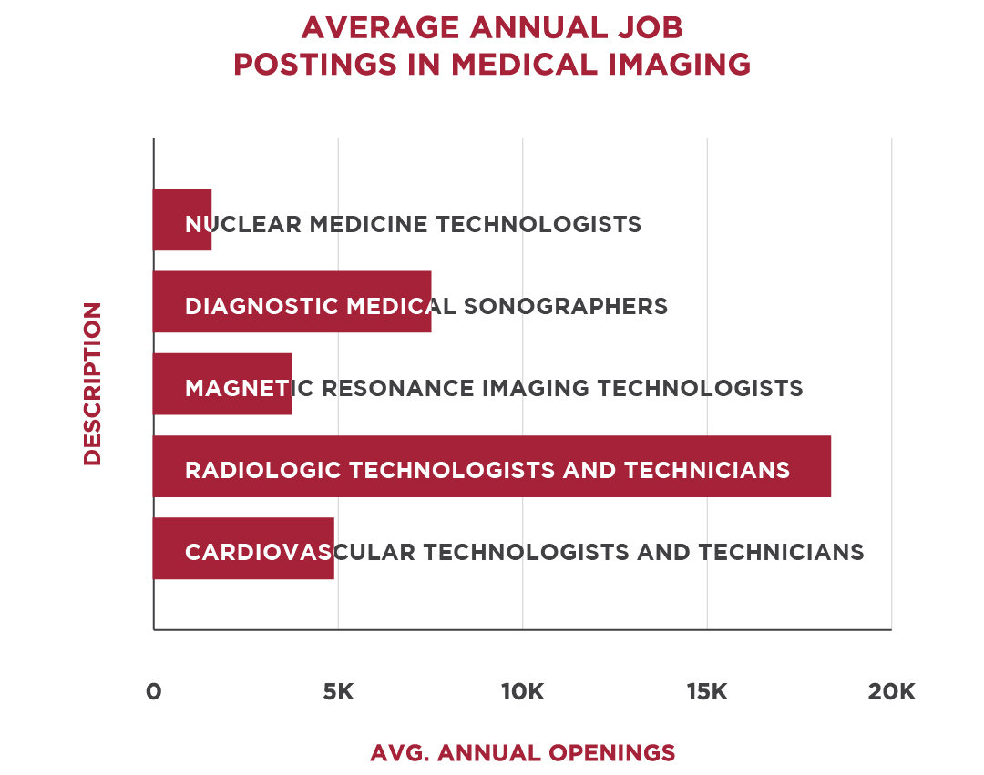 Much like other health care professions, medical imaging has seen a slight rise in job postings over the last two years (2020–2022) according to analysis of labor insights data. This type of growth is expected to continue in the next few years. According to the Bureau of Labor Statistics, nuclear medicine technologist, radiologic technologist, and magnetic resonance imaging technologist job opportunities are expected to grow between eight to nine percent between 2020–2030. Cardiovascular technologists and diagnostic medical sonographers can expect even greater growth with an anticipated 11 percent increase in employment opportunities.