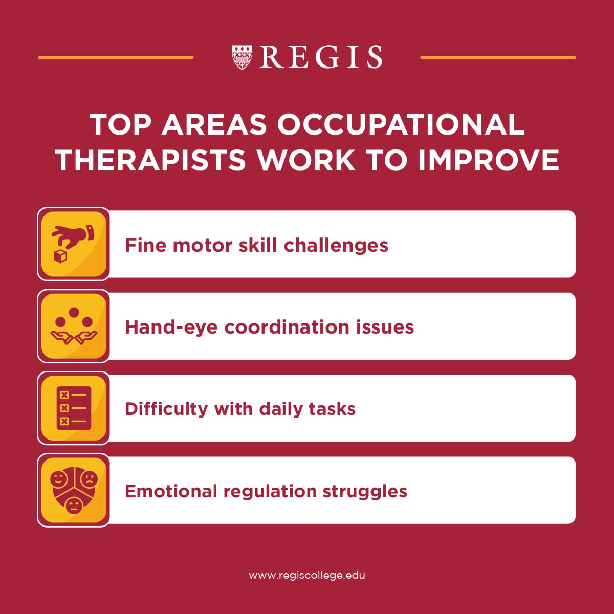 According to Michael Roberts, the Program Director for the Regis College occupational therapy program, “Inherently, those of us who are occupational therapists pursue this career because we have an understanding of the value and meaning of activity and occupation, we have a belief that the things that you do that are unique expressions of who you are—there’s an inherent value in that.”