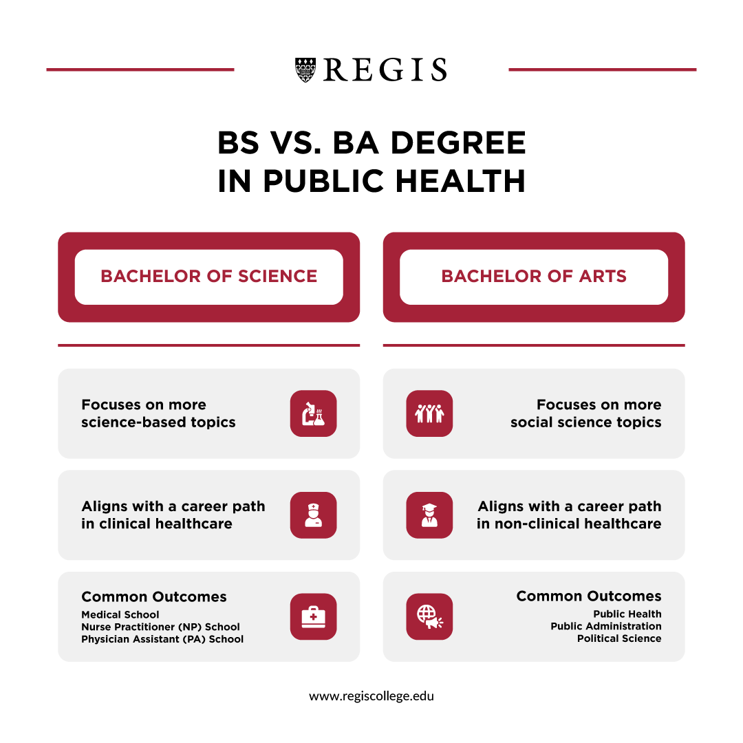 When exploring the differences between a BS and BA in public health, the larger question of career paths emerges. Even though these degrees are both excellent programs for applicants who want to pursue a career in public health, bachelor's degree graduates need to decide between two types of career paths: public health vs. clinical health roles.