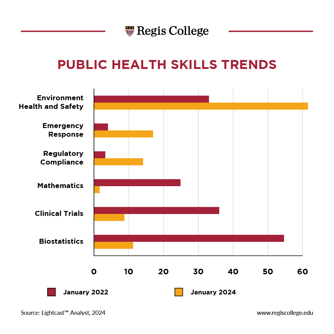 According to a 2024 job posting report, skills like environmental health and safety, emergency response, and regulatory compliance become more prevalent in public health job postings, while mathematics, clinical trials, and biostatistics skills declined.