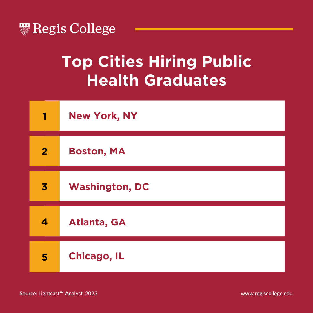 It’s important to note that the job opportunities available to public health professionals often depend on geographic location. If you’re interested in working somewhere there’s abundant opportunities for public health professionals, here are the top U.S. cities hiring graduates of bachelor’s-level public health programs, according to our analysis of job postings data: