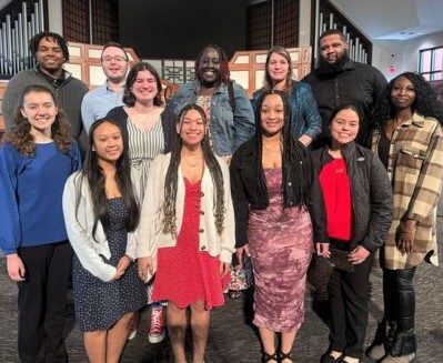 Group members included Bridgette Bowyer ’24, Kayla Busby ’25, Jalen Chappelle ’24, Katherine Cubias ’25, Leasly Diaz Beltre ’27, Jennifer Dimitrov ’25, Jaymz Lipinski ’24, Ruby Martinez ’25, Ulises Orellana ’25, Soraya Paul ’27, Madelyn Robertson ‘26, graduate students Elle Lewis’24, and Mariama Sanneh ’25, and AVP for Mission and Ministry Dan Leahy.
